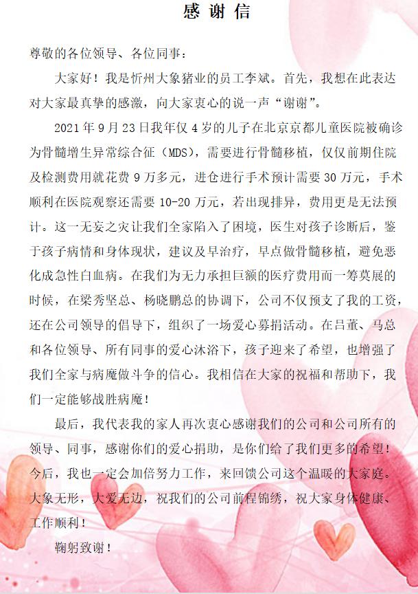 讓愛心匯成海洋,讓真情放飛希望。山西錦繡大象農(nóng)牧股份有限公司始終堅(jiān)持以人為本,實(shí)施“人性化”管理,關(guān)心員工生活,注重企業(yè)文化建設(shè),努力讓員工通過奮斗過上幸福安穩(wěn)的日子。病魔無情,人間有愛。公司作為實(shí)現(xiàn)夢想的事業(yè)平臺(tái),是每位員工的大家庭,讓我們凝心聚力、團(tuán)結(jié)奮進(jìn),共同將企業(yè)做大做強(qiáng)。