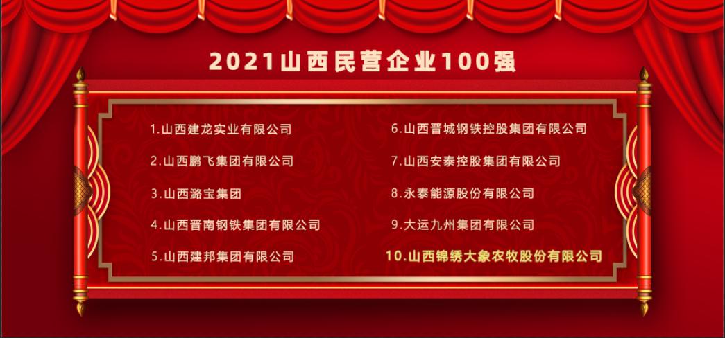 10月15日下午,在2021山西省民營(yíng)企業(yè)100強(qiáng)發(fā)布會(huì)上,山西錦繡大象農(nóng)牧股份有限公司以營(yíng)收196億元名列第十,再次進(jìn)入我省民營(yíng)企業(yè)百?gòu)?qiáng)榜單前十名。公司旗下沁水縣恒泰農(nóng)牧科技有限公司入圍2021山西最具潛力民營(yíng)企業(yè)。